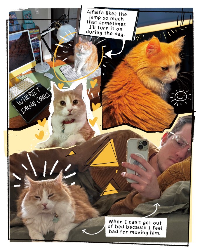 I was drawing a very sad comic (that I’m note sure I’ll post) and suddenly I noticed my cat, Alfalfa, being veeeery interested in the corner of the room. Turns out it was just a clump of his own dander.