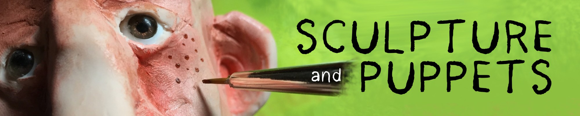 Various puppets and sculptures I have created, along with a few process shots of each one. I work in mixed media, from Sculpey clay and acrylic paints, to cardboard, fabric, recycled miniatures, woods, and latex.